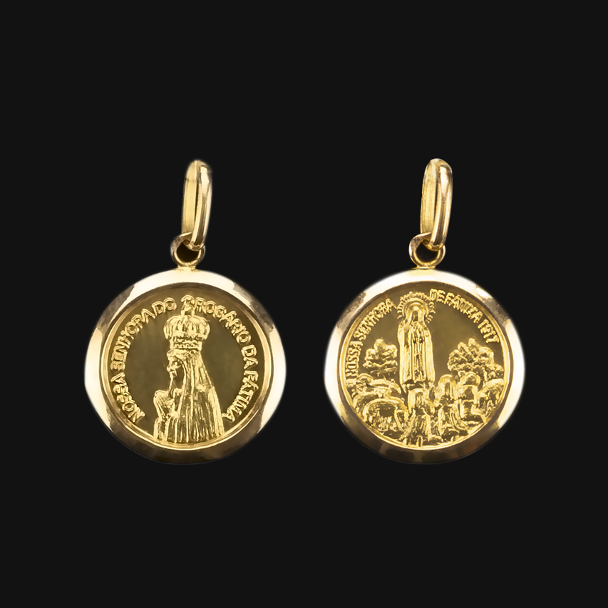Medalha aparição Nossa Senhora de Fátima redonda em ouro de lei. Diâmetro: 18 mm Peso: 1,5g