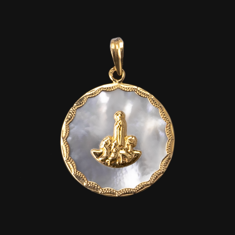 Medalha Nossa Senhora de Fátima Aparição em madre pérola e Ouro de Lei (19,2 quilates).