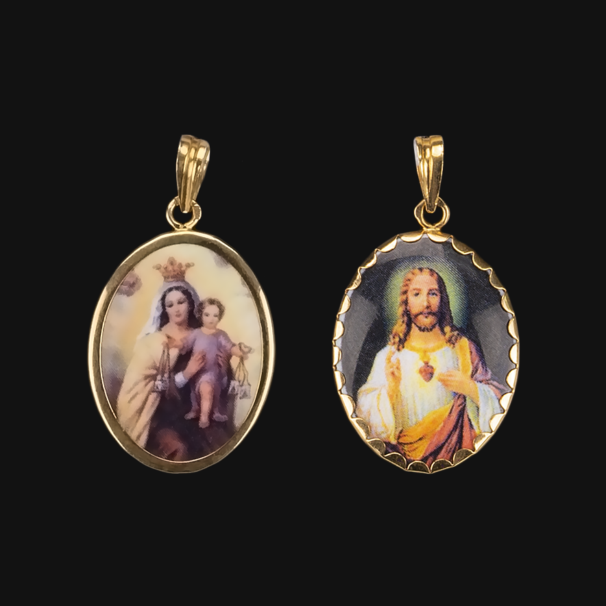 Medalha Nossa Senhora do Carmo e Sagrado Coração de Jesus em Ouro de Lei (19,2 quilates) com bordas lisas.