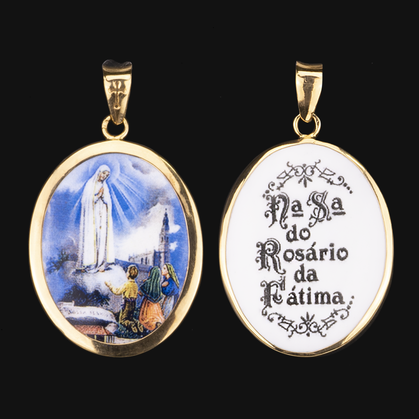 Medalha Nossa Senhora do Rosário da Fátima Colorida Oval, borda lisa e em Ouro de Lei (19,2 quilates).