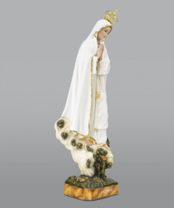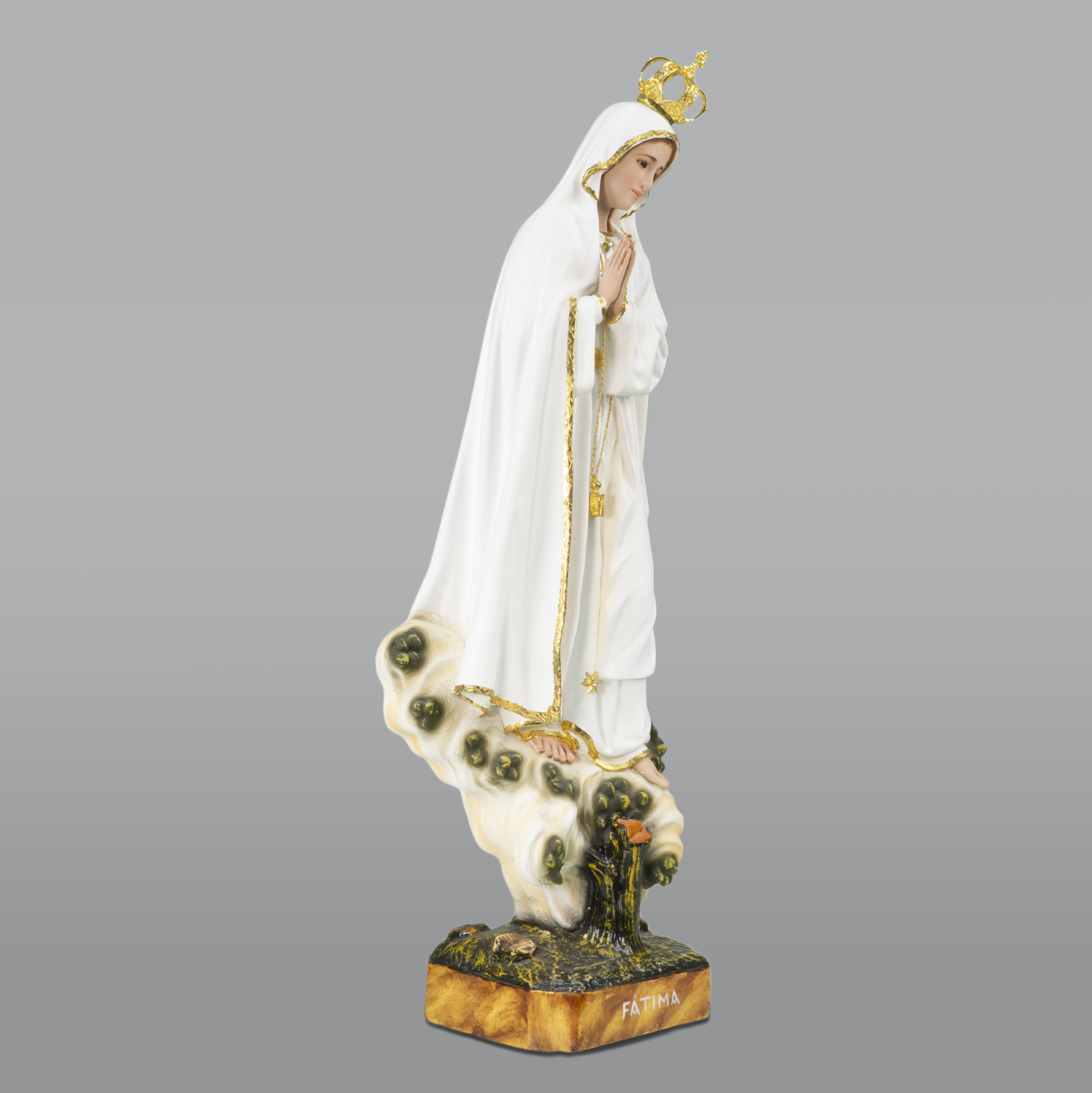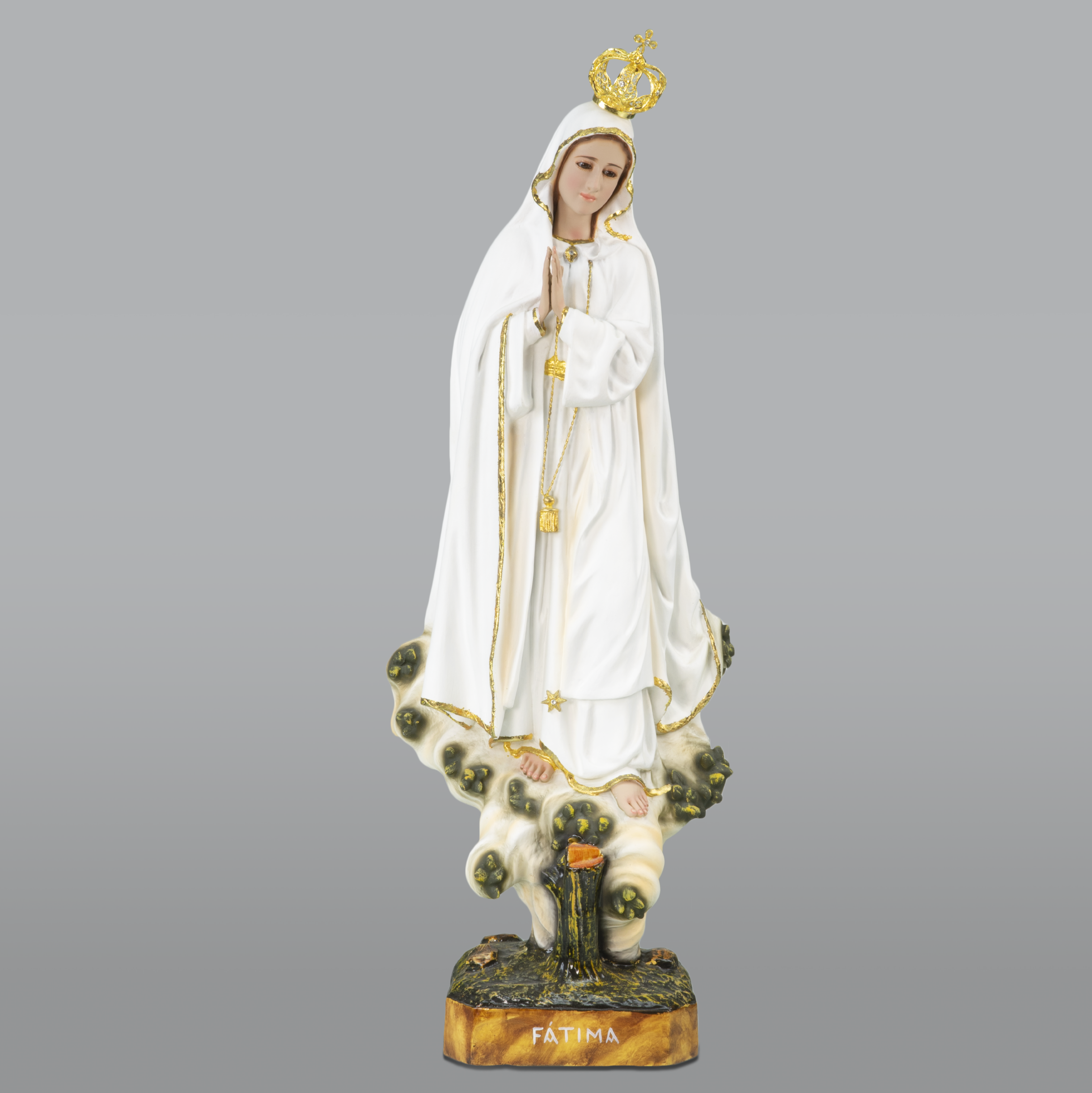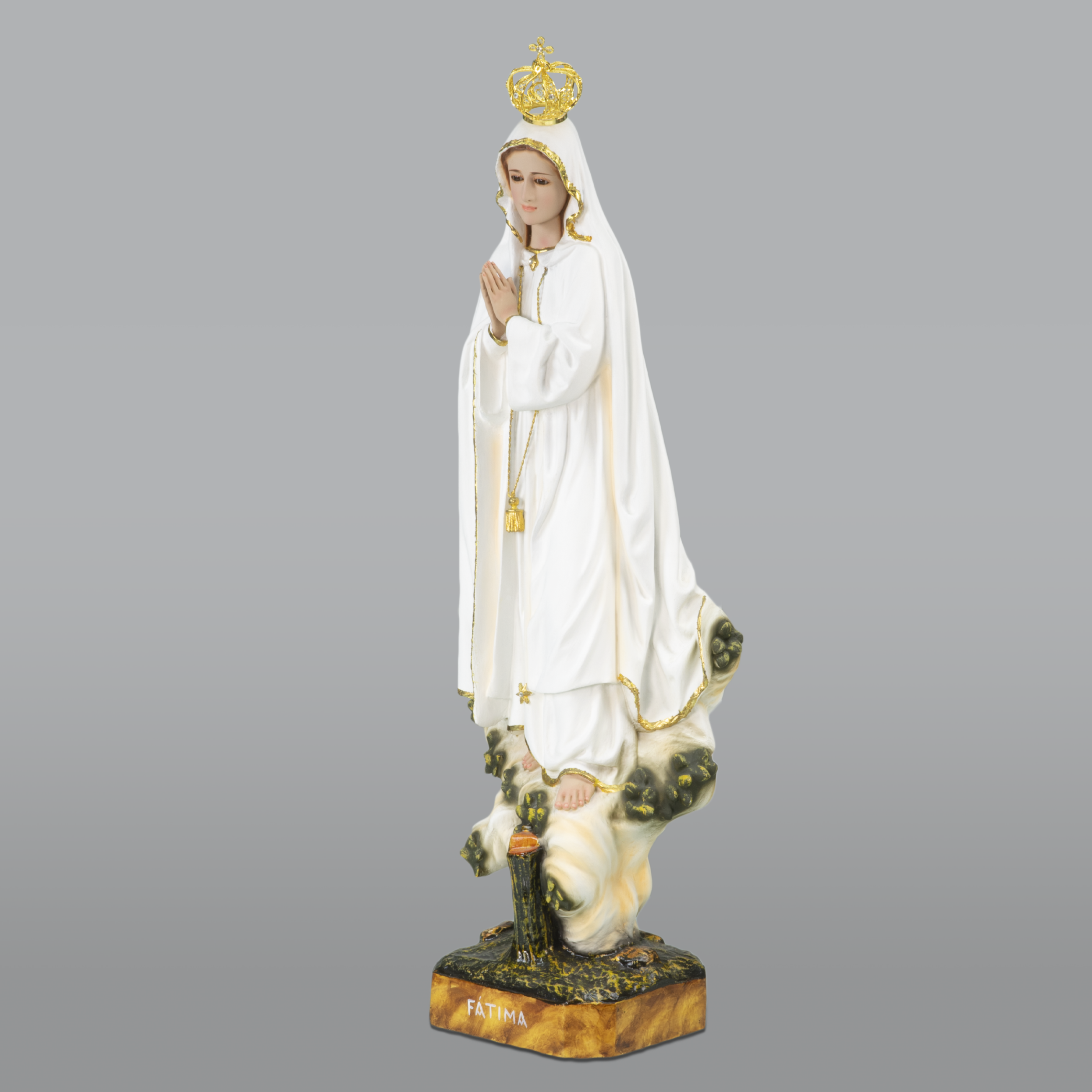 Imagem de Nossa Senhora de Fátima Azinheira, esculpida em madeira à mão, pintura a óleo e ouro fino. Pintada à mão.