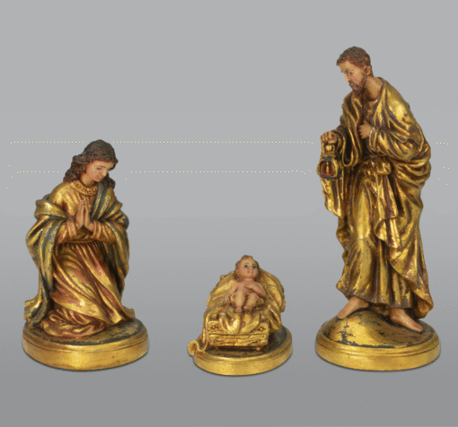 Presépio em marfinite, pintura a óleo e ouro fino. Pintada à mão.