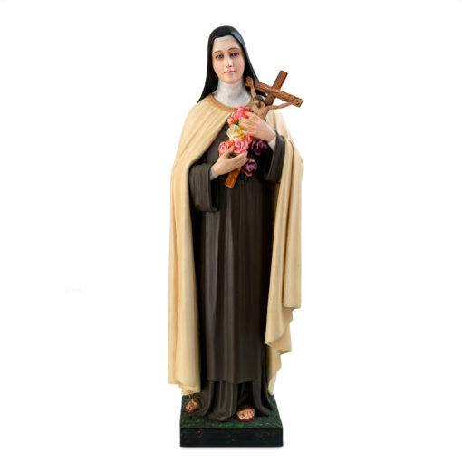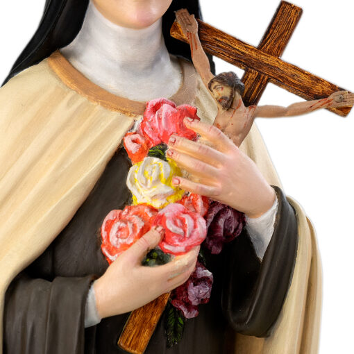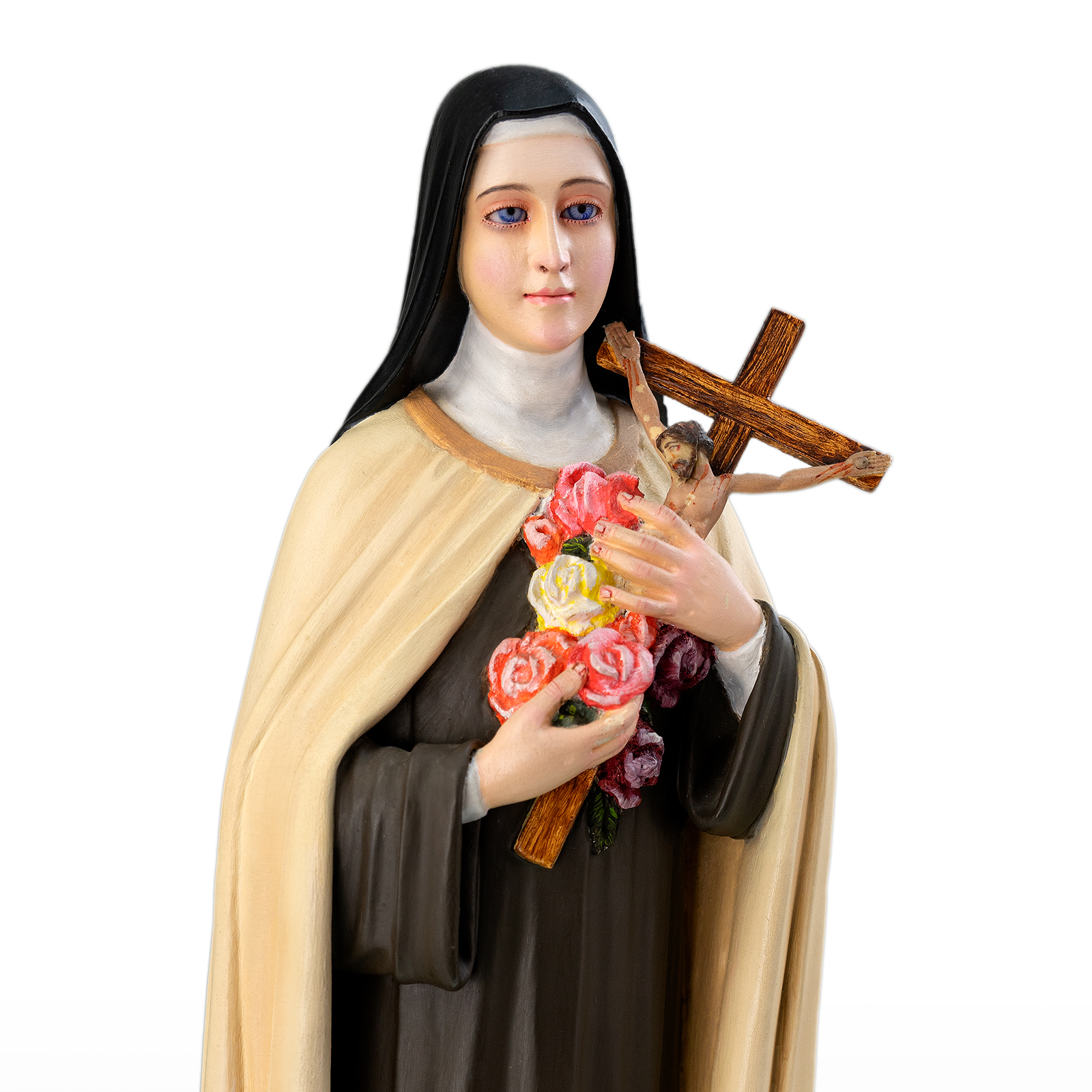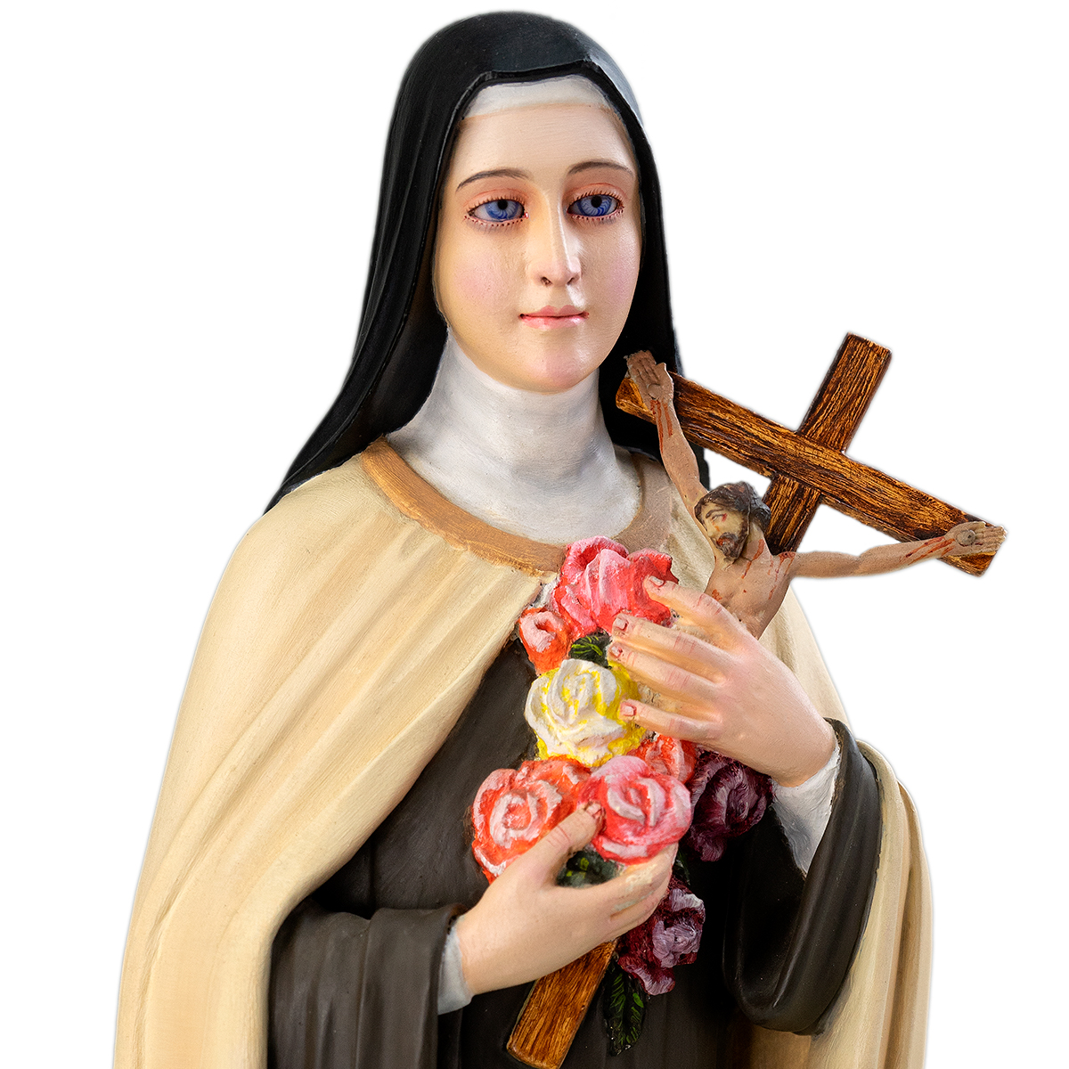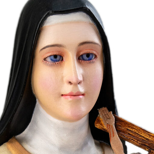 Escultura de Santa Teresinha em madeira, pintura a óleo e olhos em cristal.