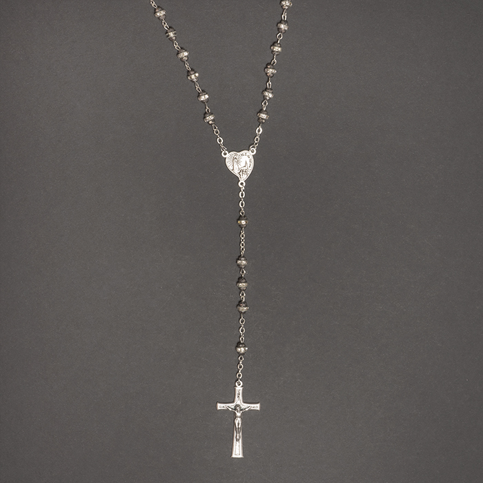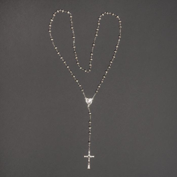 Terço em metal com cristal cinza – 55 cm de comprimento.