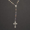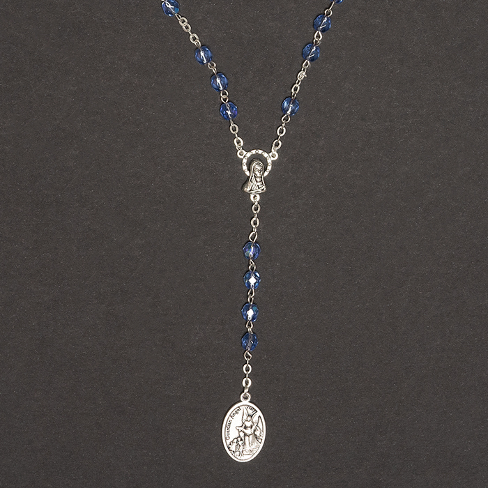 Terço em metal com cristal azul celeste.